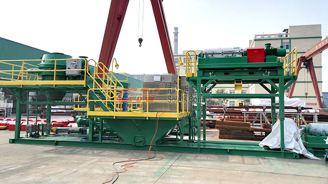 本套撬裝系統分為三個部分,撬裝兩端是用來安裝鉆屑甩干機單元和廢漿專用的沉降臥螺離心機單元。中間部分設有一個圓錐型泥漿罐,用來存儲從鉆屑干燥單元排放出的液相部分,甩干機及離心機的變頻控制部分安裝于錐形罐的上方,為控制設備及監控設備運行狀態提供了方便。